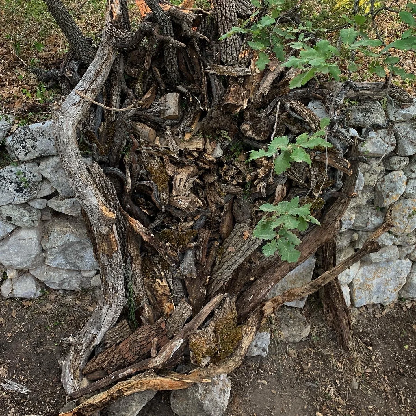an ephemeral sculpture created on the Maison Basse trail in Lacoste, France | made out of broken branches from the vineyard & bark/ rotting branches off White Oak trees | June 2022 |iInspired by the works of Andy Goldsworthy rotten roots